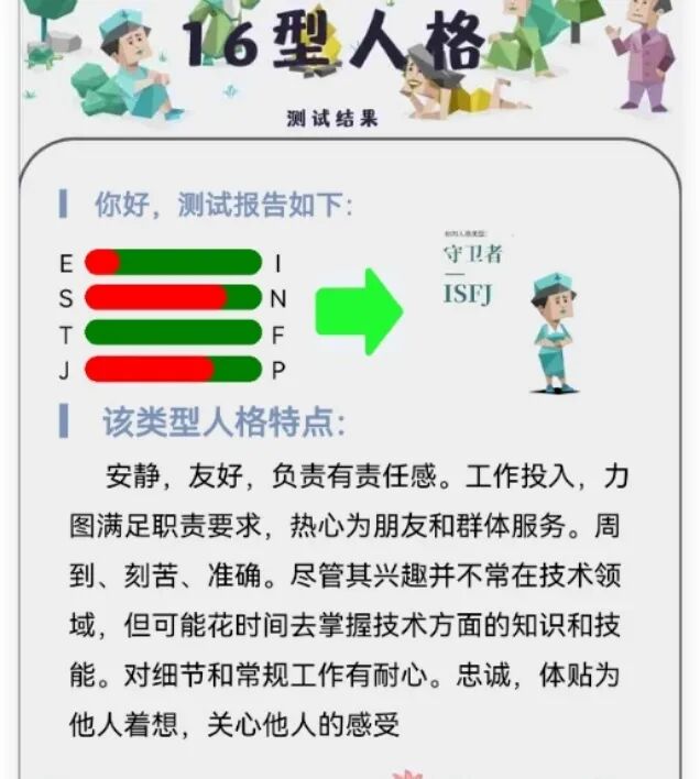 大概的意思就是:i代表内向人格。e代表外向。关于这方面的说明,有兴趣的小伙伴可以到网上去搜一下,也可以去测一测自己的人格。搜索“人格测试”网上有很多软件可以测。
