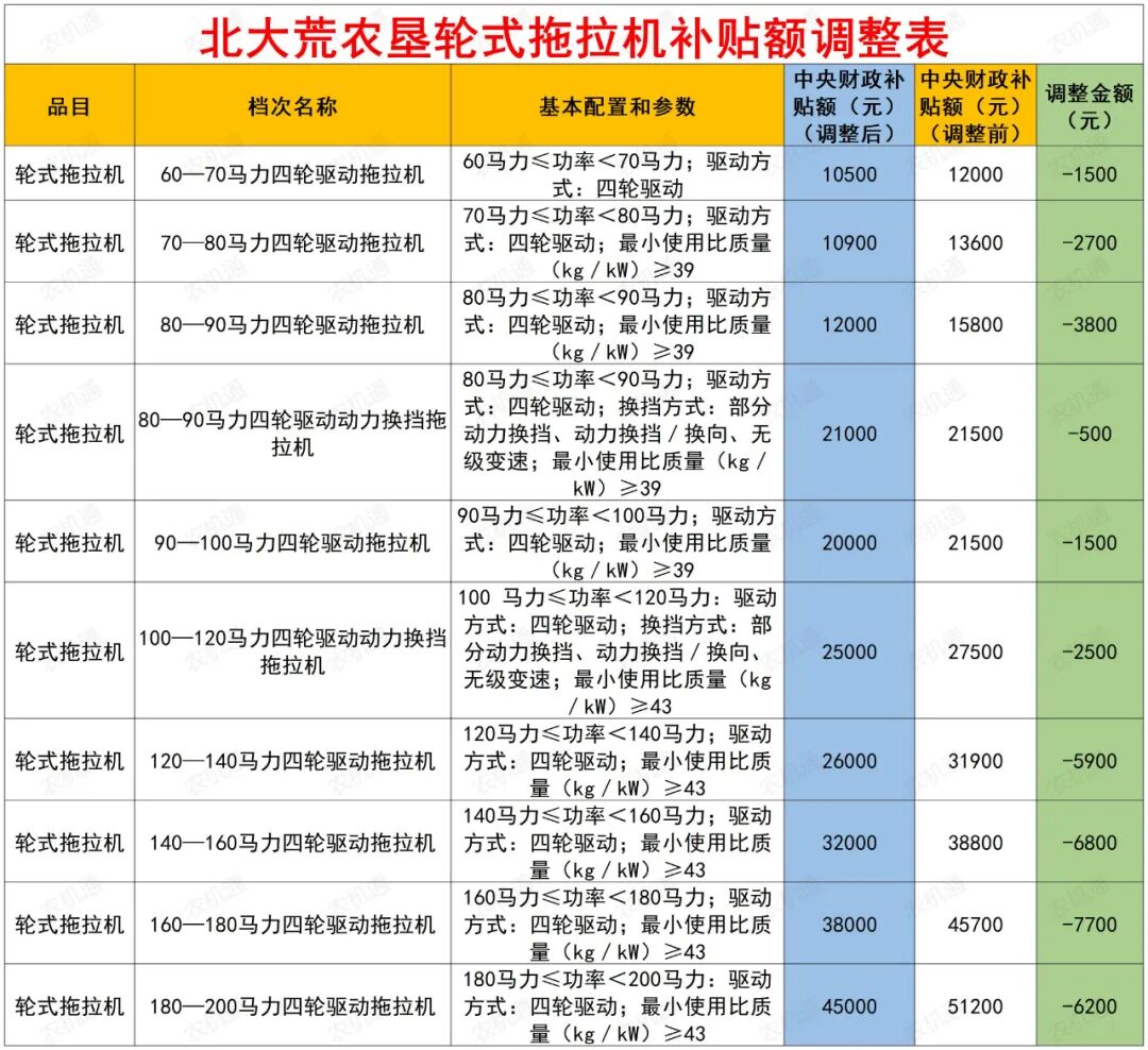 目前调整的这些地区,小编都做了数据对比,大家可以看下自己所在省(市)的调整数据。这些轮式拖拉机补贴额调整表中,河南,江西,安徽,内蒙古自治区等地均为公示稿,待公告稿发布后,农机通也将第一时间为大家发布,敬请关注!