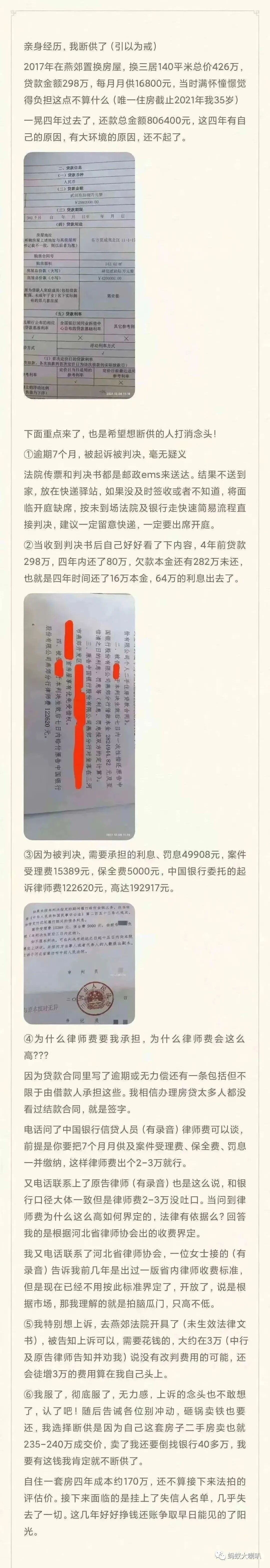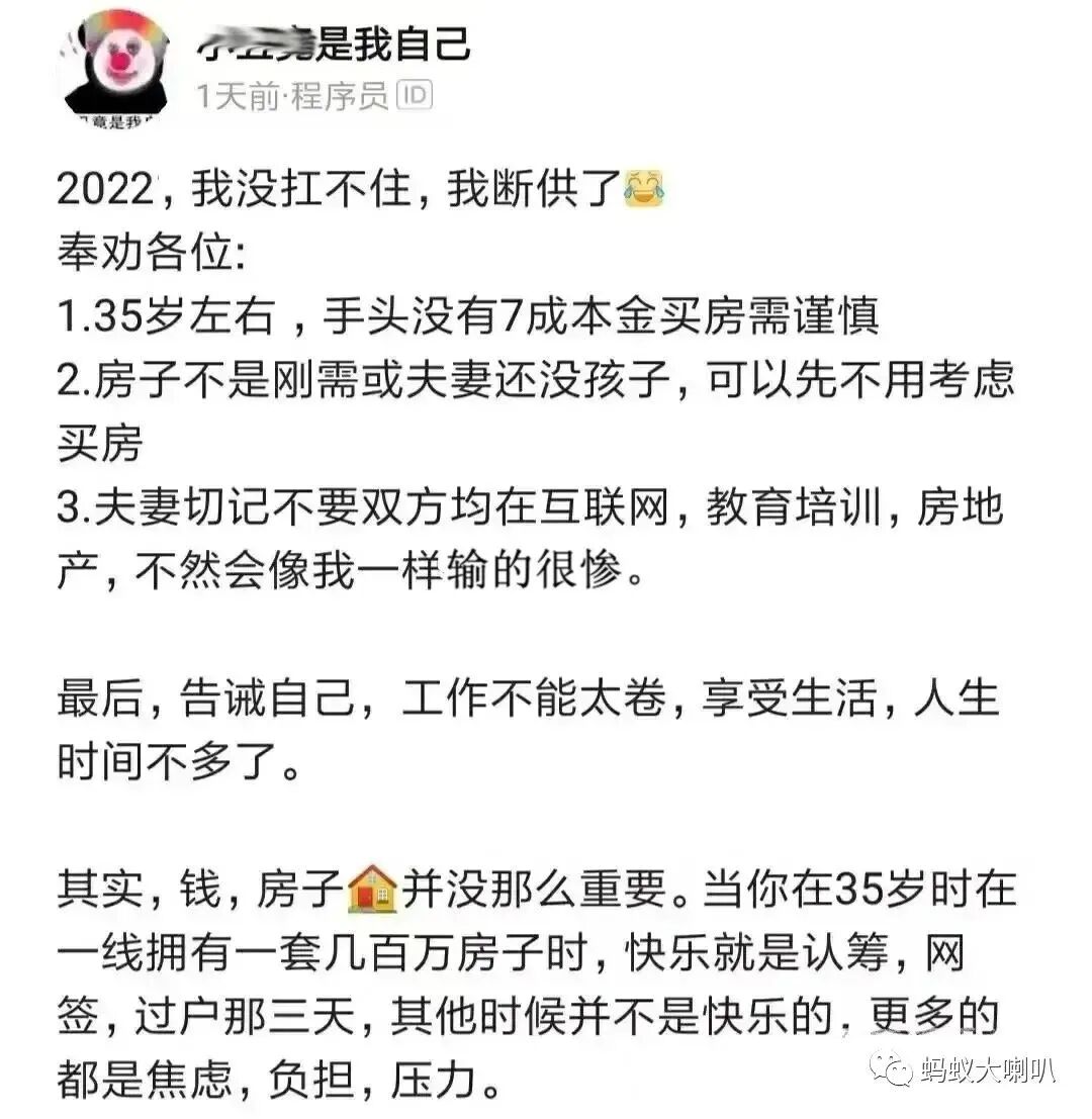 还有一位北京某大厂程序员无奈发出来自己的痛苦经历,称后悔花400多万在燕郊买房。因为行业不景气,现在收入日益下降,最终撑不住了,不得不断供。