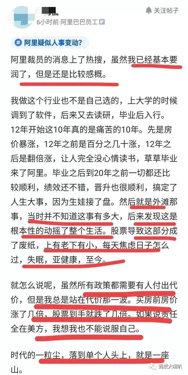 去年三月份,阿里被爆出裁员的时候,就有阿里员工发文称:“硕士研究生毕业之后,进入阿里,一直发展很顺利,但是,外滩那件大事,根本性动摇了整个生活。股票成了废纸,上有老下有小,每天焦虑,失眠,亚健康到现在。”他最后感叹道:“自己总是站在代价那一波,买房前房价涨了几倍,股票到手跌了几倍。”
