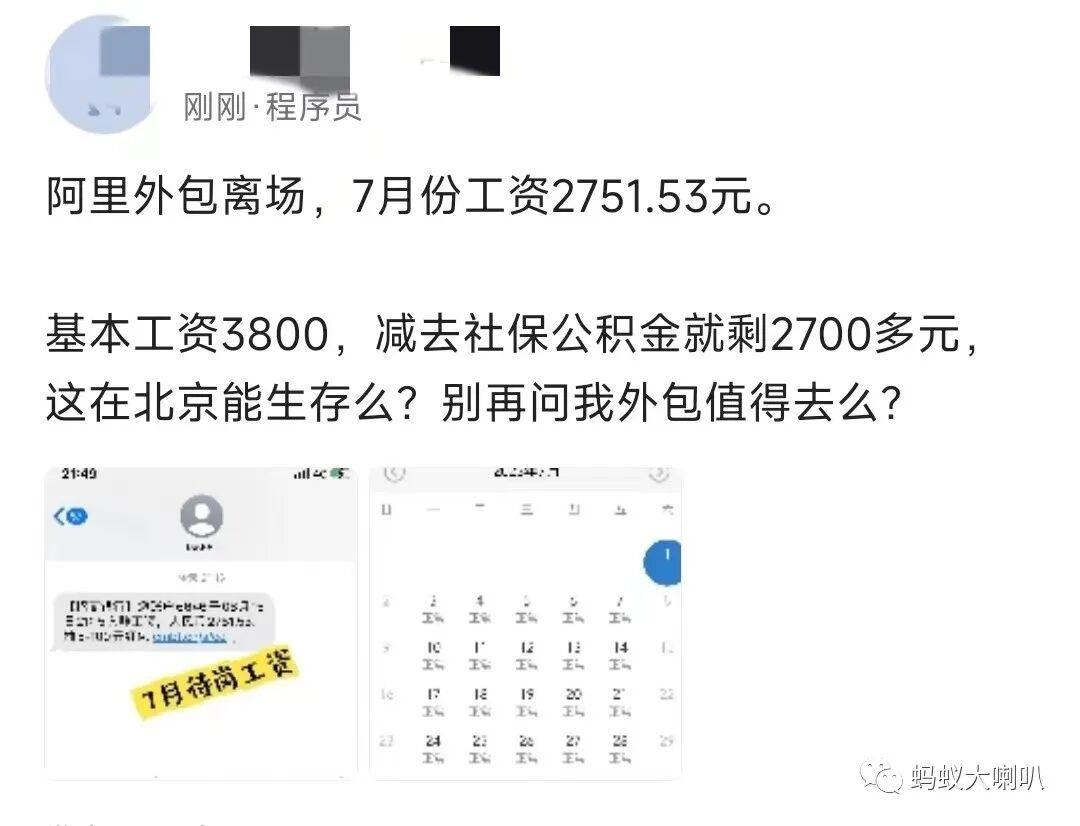 一位阿里外包员工项目结束离场,晒出待岗期间的工资,整个7月份扣除五险一金只有2751.53元。这在北京还能怎么生存,估计连房租都够呛。