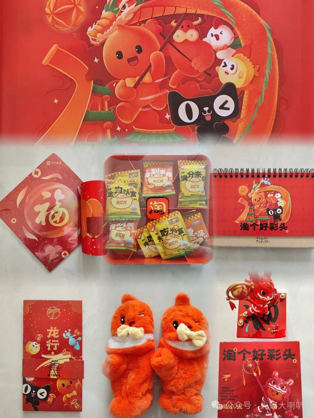 包装精美的双层盒子。里面包含:春联套装*1、零食套餐*1(内含开心果*2、葡萄干*2、手撕肉干*2、夏威夷果*2、碧根果仁*2、芒果奶糕*2)、红包*6、日历*1、淘公仔手套*1、龙年淘公仔*1。