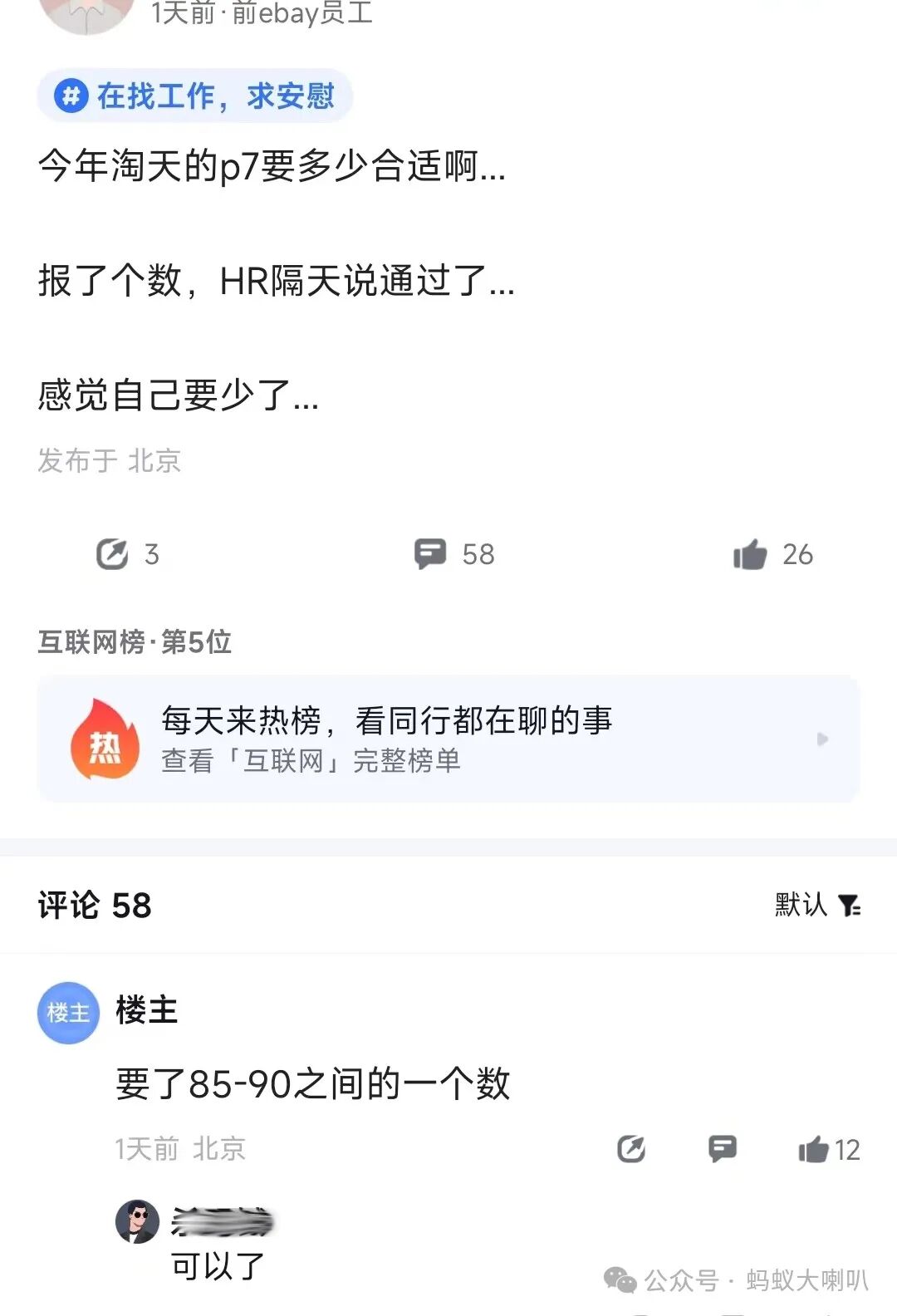 一位准备入职阿里的网友发帖询问:“今年淘天的P7(薪资)要多少合适啊?面试成功后报了个数,HR隔天说通过了,感觉自己要少了。”通过该网友在帖子下面的回复可知,他要的年薪在85万-90万之间。