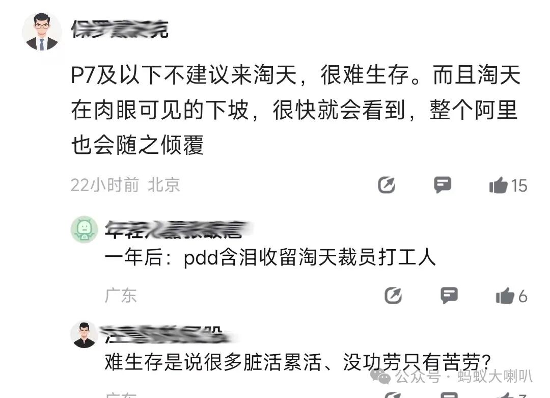帖子发出之后,疑似阿里的员工看到回复:建议P7及以下不要来淘天,很难生存。给出的理由是淘天在肉眼可见的下坡,很快就会看到,整个阿里也会受到很大的影响。潜台词就是小心将来被裁。