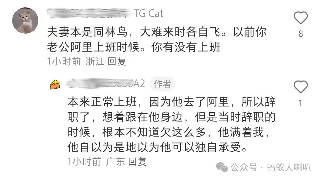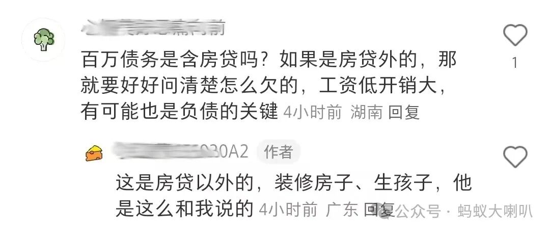 从评论区留言可以了解,帖子中所欠的百万债务不包含房贷在内。这样算的话,如果算上房贷,整个债务压力是挺大的。老公阿里被裁,没有在当地城市找到合适工作(大概率薪资给不到阿里在职时的水准),被迫北上,说明家庭现金流岌岌可危。