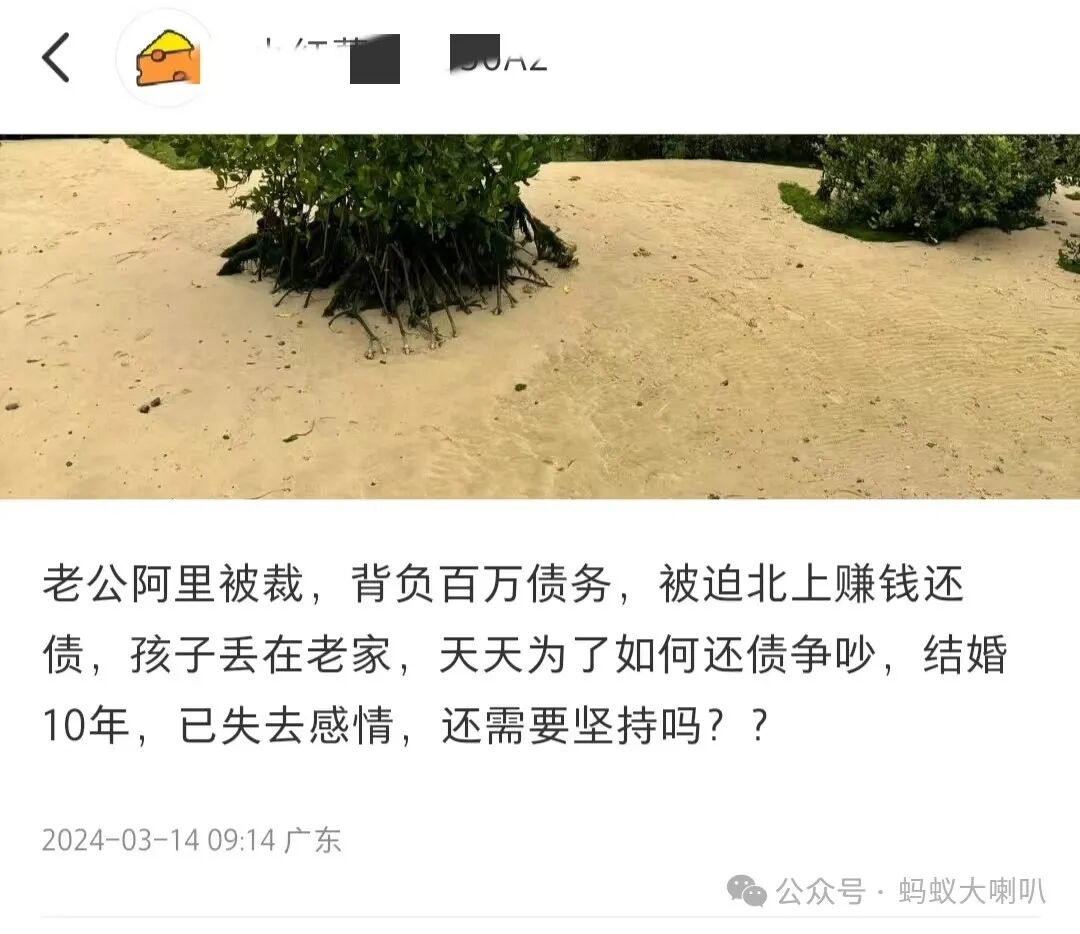 对于男人来说,失业、负债、老婆闹离婚同时发生在一起,这应该属于人生中最黑暗的日子之一。某网友发帖:“老公阿里被裁,背负百万债务,被迫北上赚钱还债。孩子丢在老家,每天为了还债的问题争吵。结婚10年,已失去感情,还需要坚持么?”