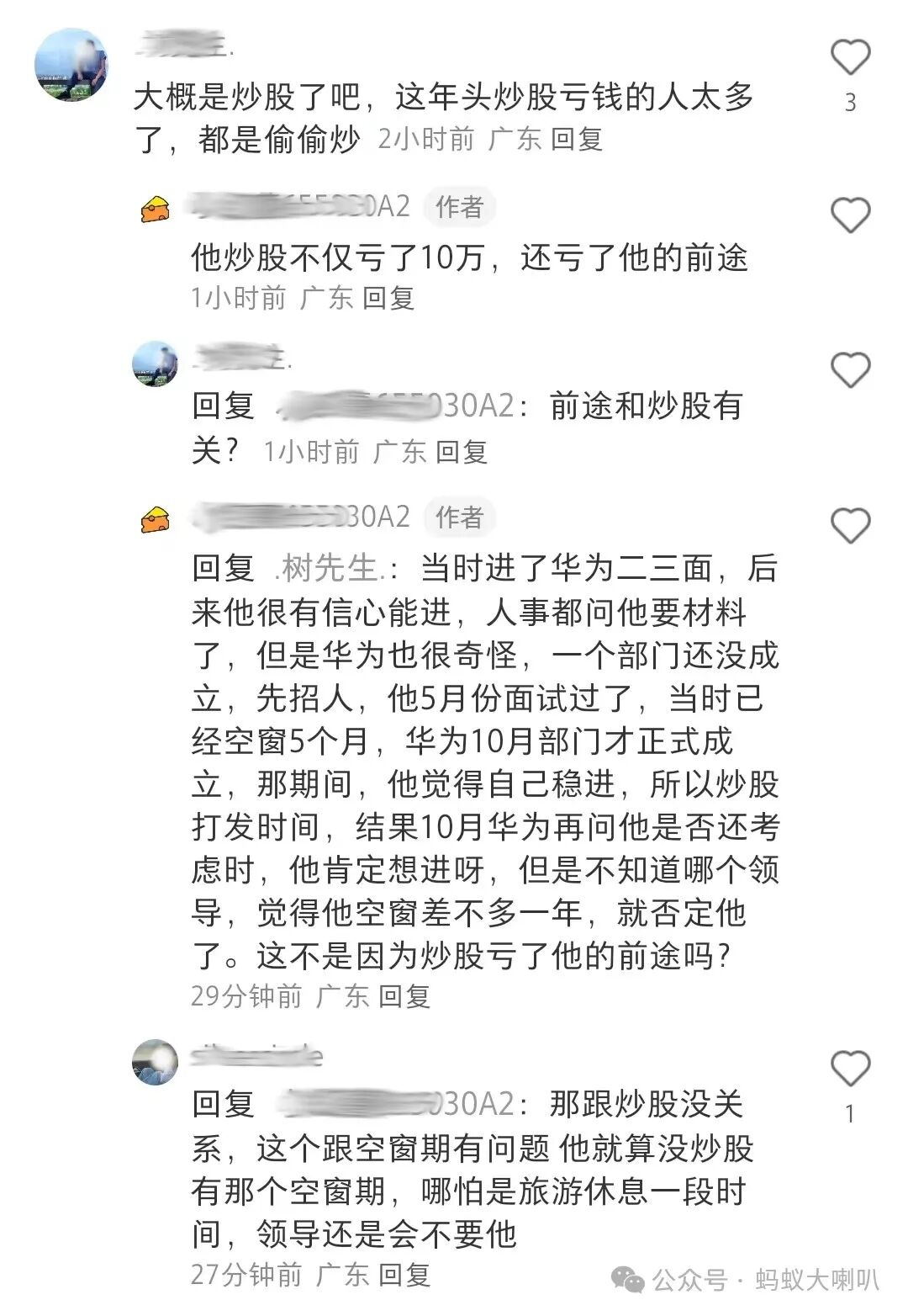 这位丈夫走到这一步最大的失误是被裁后,在等待华为的Offer过程中,没有积极寻找别的工作岗位,反而居家选择了炒股打发时间。最终华为认为他空窗期太久没有录取,炒股也赔了10万,教训真够惨痛的。这也告诫我们:面试公司只要没有拿到Offer,办理入职手续,随时都有被“放鸽子”的可能。还有就是,炒股有风险,入市需谨慎。