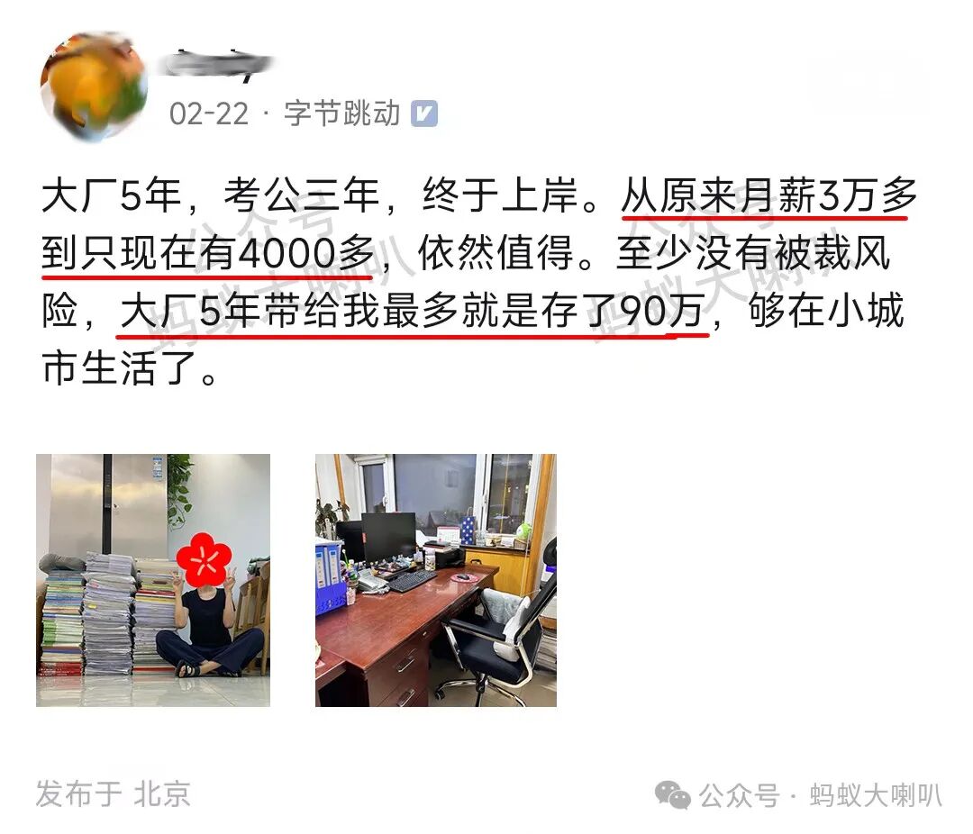 大厂工作存钱,然后赶到35岁之前上岸。这应该是很多在大厂工作员工的梦想,钱赚到了,稳定也有了。充分诠释了既要、又要的中心思想。一位字节员工发帖:“大厂5年,考公三年,终于上岸。从原来月薪3万多到只现在有4000多,依然值得。至少没有被裁风险,大厂5年带给我最多就是存了90万,够在小城市生活了。”