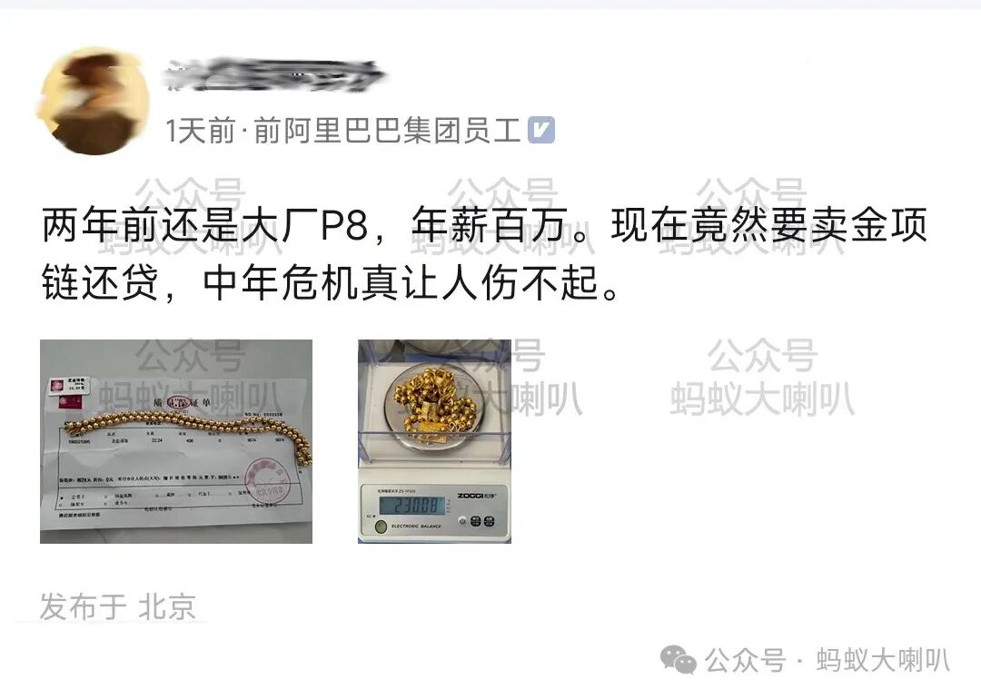 什么是“中年危机”?我对此的简单概括就是人到中年时期经历的经济危机。一位认证为前阿里员工的网友发帖:“两年前还是大厂P8,年薪百万。现在竟然要卖金项链还贷,中年危机真让人伤不起。”不知道他离开阿里后经历了什么?但是到了需要卖金项链还债的地步,看来债务危机挺严重的。