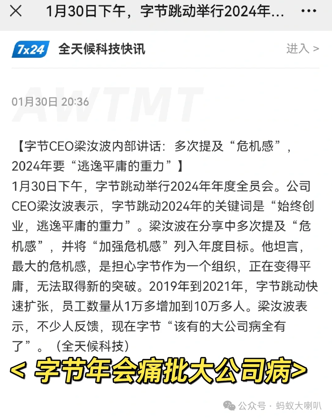 字节:CEO梁汝波年会上痛批大公司病,多次提危机感。