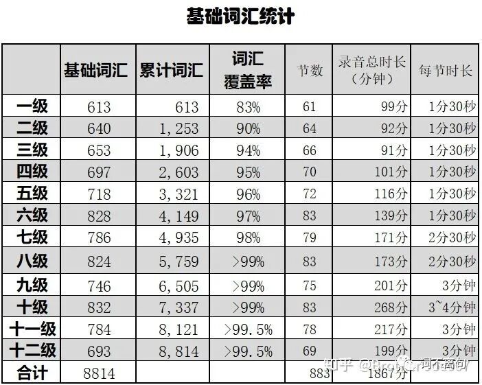 从上表看到,前面4级2600词,就扫荡了普通英语文章的95%的词汇,这一步务必掌握好,要注意学习效果,在脱离文本的情况下做到“听得懂,说得出,写得出句子来”!