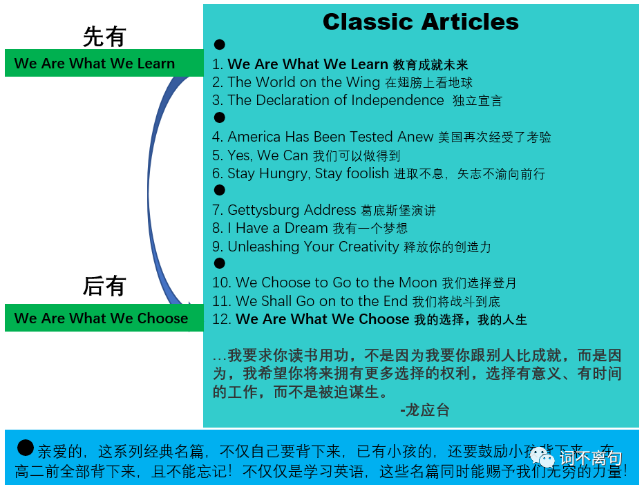 一、背单词并不是有效的语言学习行为,哪什么是有效的行为呢?1、把一条句子记下来的作用比背一个单词要有效得多;2、脱离文本去听与复述比照着文本去朗读要有效得多;3、把一篇文章背诵至烂熟比浏览十篇文章要有效得多;4、规律地循环复习所学内容比一味地推进要有效得多;5、在语言学习中理解语法比去背语法规则要有效得多;6、每天去训练比断断续续的学习要扎实得多有效得多!务必务必务必要注意:坚决提防水过鸭背式的学习!它无法让你前进,哪怕只是一步!●有效的学习行为才决定我们的考试成绩!二、背诵一些文章对语言学习也非常有帮助,比如如下这些: