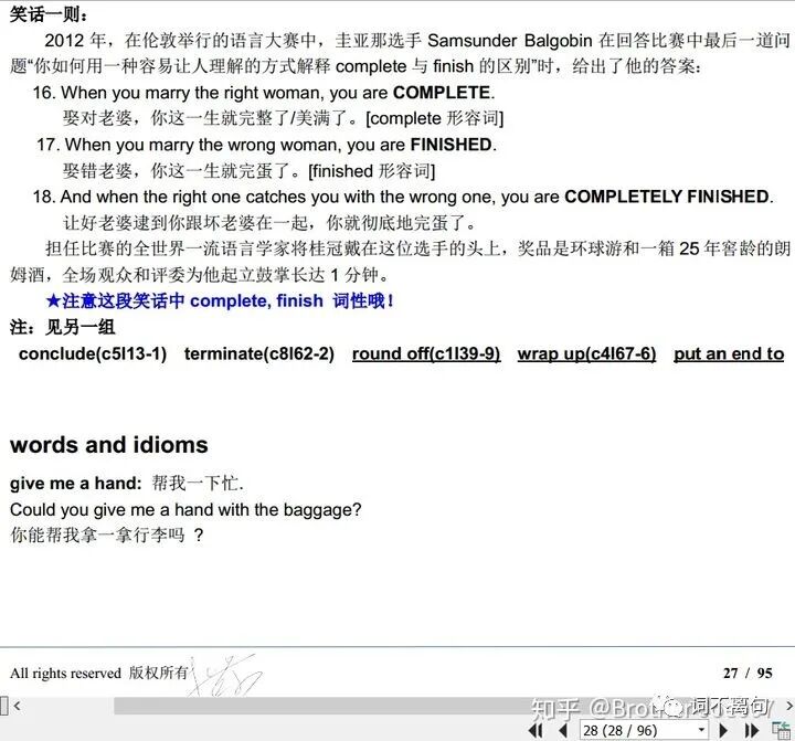 二、知道语言的学习理念语言学习有八字要诀:“词不离句,句不离篇”:学习单词时不要离开句子,通过阅读,加强巩固对词汇的理解。参照物:complete 与 finish的笑话