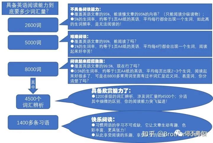 【为什么英语单词词组都看得懂、语法也都了解,但是英文文章(好几千词的那种)读起来还是那么累?】好几千的词汇量并不足以让我们流畅地阅读英语文章,词汇量与阅读的关系大概如下图: