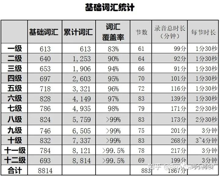 要达成英语的基本阅读能力,需要学习8000+的常用词汇,如下表(来自《词不离句:英语常用词汇8000分级过关》,链接在“训练指南”评论区内,或百度一下“词不离句”):