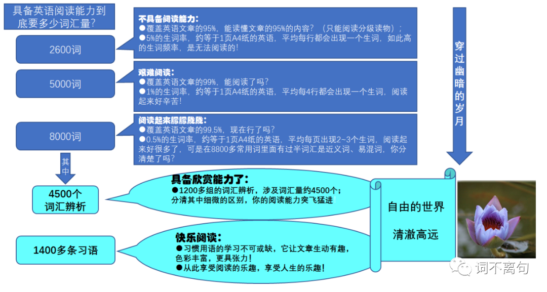 如下有个大概的统计:其实,词汇的深度与广度更加重要,即一词多义,易混词的辨析,习惯用语的使用等更加考验我们对语言的掌握程度!●英语高频词大多都是多义词,如 light,一个非常常用的单词:1. The light was beginning to fail (= it was beginning to get dark).天色渐暗。【名词】2. It was an hour before the lights came on again.一个小时后灯才再亮了。 【名词】3. We'll leave in the morning as soon as it's light.明天早晨天一亮我们就出发。【形容词】4. Carry this bag--it's the lightest.你拿这个包~它最轻。【形容词】5. She lit a candle.她点着了蜡烛。 【动词】●再来看看易混词的辨析,如下,注意黑体字:6. That to secure these rights, Governments are instituted among Men, deriving their just powers from the consent of the governed.7. He has kept among us, in times of peace, Standing Armies without the Consent of our legislatures.