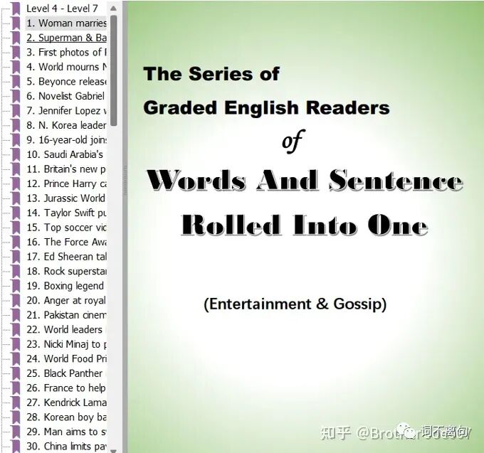 G-WASRIO [dʒi:-wəzriə] ”共计12册,涵盖“娱乐与八卦, 科学与技术,医学与健康,经济与金融,政治与军事,人文与环境,文化与旅游,生活,话题,教育,轶闻奇事及其他”等的新闻播报内容。每一篇文章都按易难程度分4个级别(中级),或3个级别(高级)写成,从易到难有7个级别,共计1528篇文章,字数100万字。详细请到如下去了解(蓝色字体是链接):