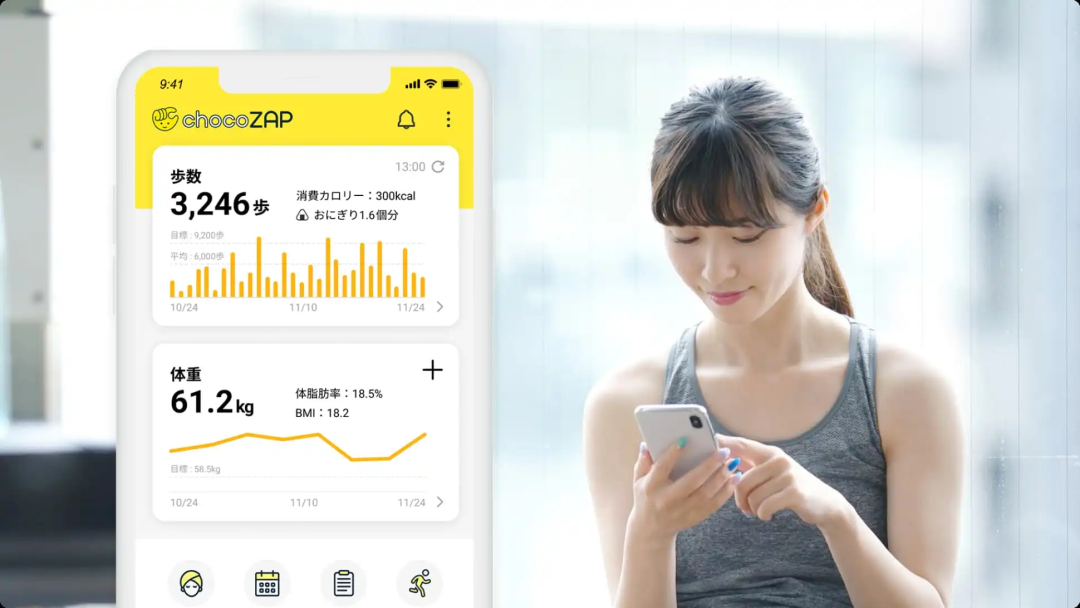 「运动也并不是每天都要去健身房,」Rizap海外事业部顾问柳下俊宏则指出,chocoZAP手机app会依照个人目标及各项数据,投放最适合的指导影片,「鼓励会员,在家轻松运动也会有效果。」