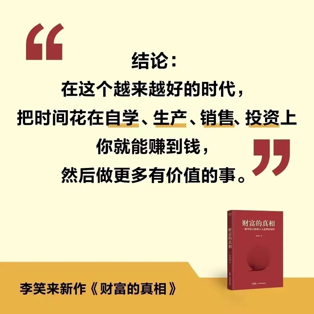 李笑来说过:在这个越来越好的时代,把时间划到自学、生产、销售、投资上你就能赚到钱,然后做更多有价值的事。