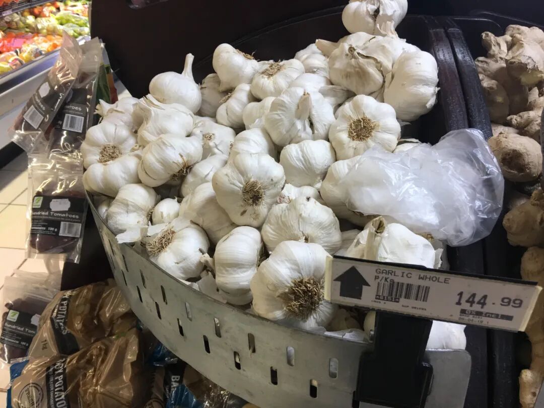 我有一年到了南非的一个小镇上。那边的超市里,就卖大蒜。我看了下是来自山东的金乡。这个就是南非一个小镇上大蒜的价格,每公斤144.99南非兰特。