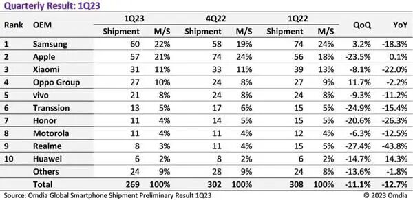 华为在全球智能手机市场份额,便从2020年的第3名,直接跌落到目前的第10名(如果跟荣耀合并计算则为第6名)。