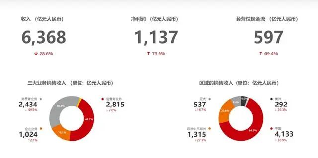 2023年3月31日下午,华为召开发布会正式发布《华为2022年度报告》。2022年销售收入6423亿元,同比增长0.9%,净利润356亿元,同比下降68.7%。经营活动现金流178亿元,同比下降70.2%。