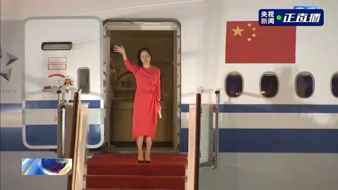 2021年 9月25日晚,孟晚舟在结束被加拿大方面近3年的非法拘押后,乘坐中国政府包机抵达深圳宝安国际机场,顺利回到祖国。