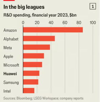 回想起来,美国的闪电战只是短暂地动摇了这个帝国。华为去年的销售额约为1000亿美元,是美国科技公司甲骨文的两倍。它的规模只有韩国手机制造商三星的一半,但在研发方面的支出却超过了三星。事实上,2023年,华为的研发预算为230亿美元,只有美国最大的几家科技公司超过了它:Alphabet(谷歌的母公司)、亚马逊、苹果和微软。去年的利润约为123亿美元,与美国通信集团思科系统不相上下,远远超过了其移动网络业务的主要竞争对手爱立信和诺基亚。爱立信和诺基亚正在裁员,而华为的员工人数却在增加。目前,华为的员工人数比2021年增加了12,000人。