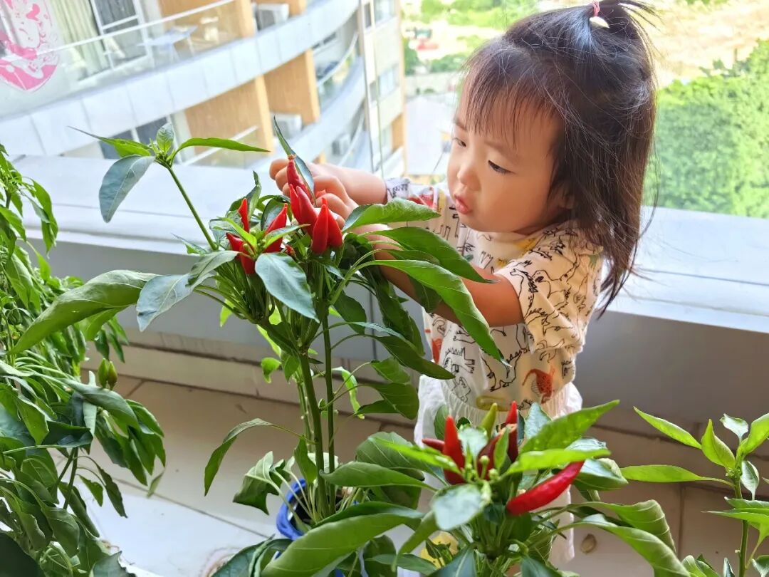 女儿在阳台上摘辣椒
