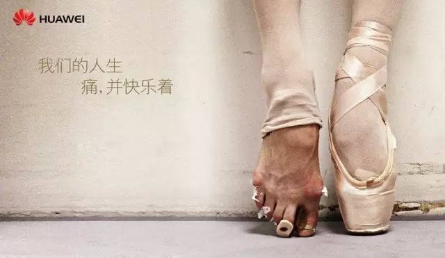无独有偶,华为曾在内部推了一个芭蕾脚的宣传广告。广告中,一只脚穿着优雅的芭蕾舞鞋光鲜亮丽,另一只脚却赤裸着,满是伤痕。美与丑、优雅与不堪,形成强烈的视觉冲击。有人评价说:“(图)虽然不美,但反映了华为之所以是华为的原因”。