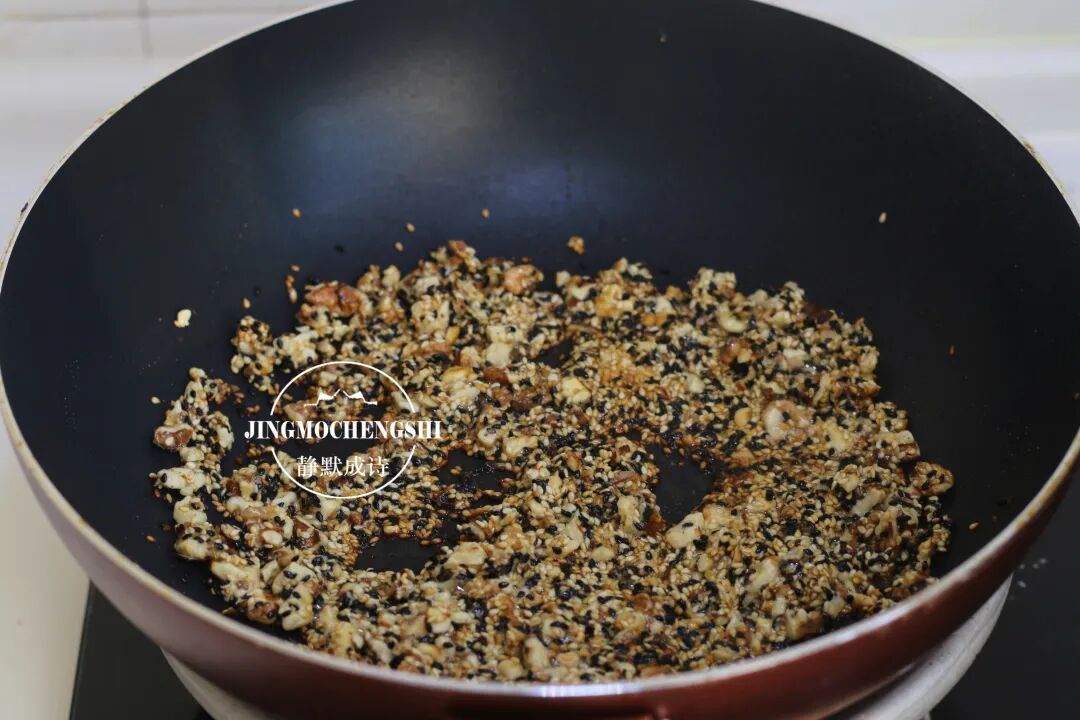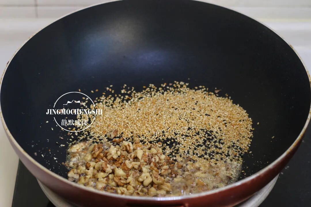 ②核桃仁和花生仁要提前炒熟或烤熟,然后放进食品袋,用擀面杖擀碎一些,保留些颗粒。除了芝麻、核桃仁和花生仁,还可以再准备些果脯之类的辅料。