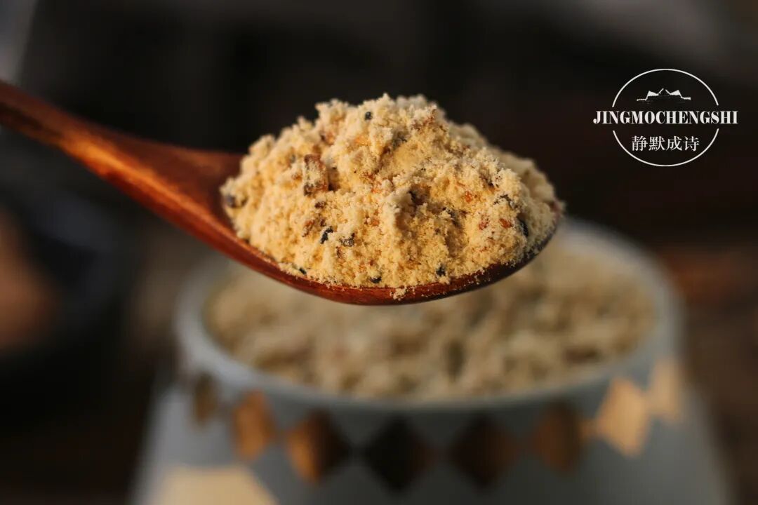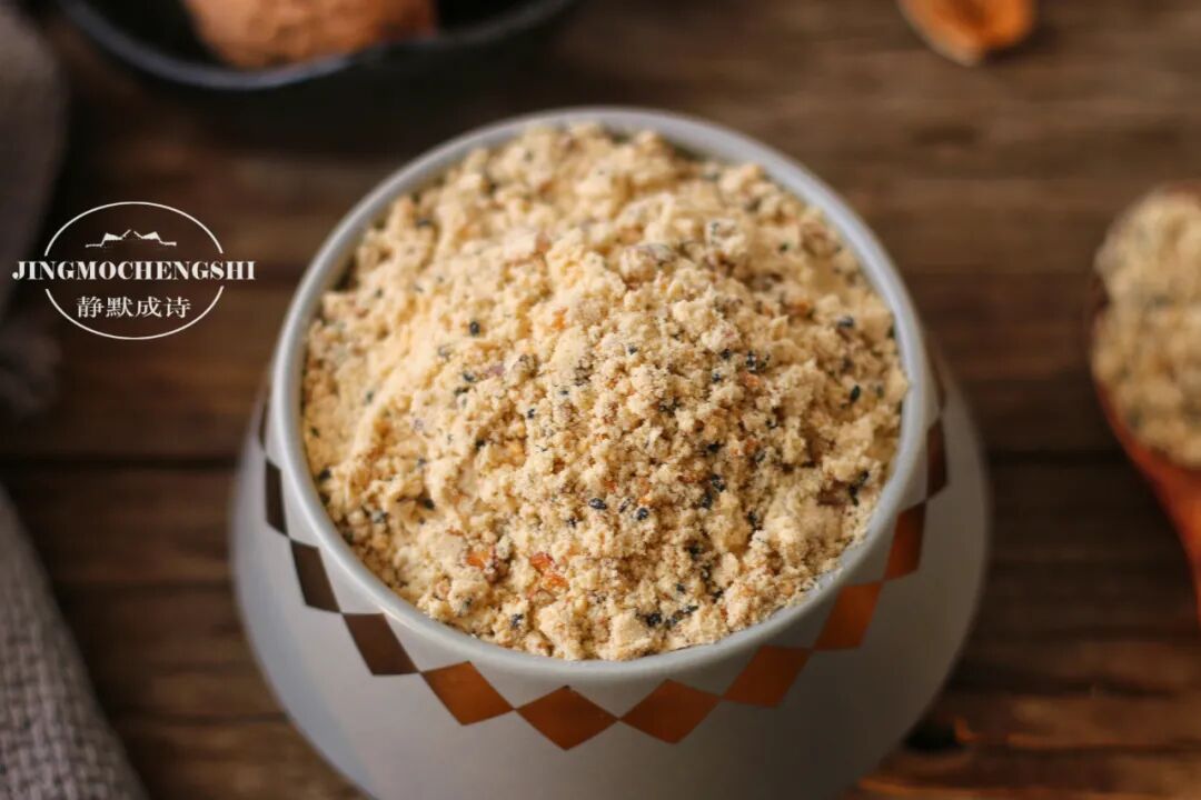 一晃多年,现在还能回忆起油茶面,可见它对我的印象是深入骨髓的。油茶面的食材常见,所以家里都有,三下五除二,撸起衣袖,说做就做。油茶面,其实就是炒面,加了各种果仁配料的炒面,直接用滚烫的水冲开了,调成糊状,即可以当早餐,又可以当下午茶,味道可甜可咸,全凭自己喜好。十几分钟,油茶面就炒好了,给自己冲了一碗,就是记忆中的味道,真香!可惜斗转星移,物是人非,我也只能在油茶面的味道里忆着过去的种种,同学的音容笑貌似在眼前。