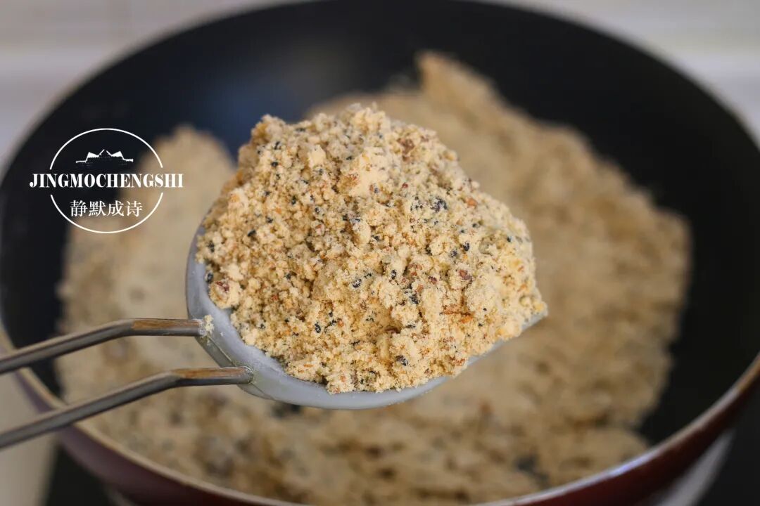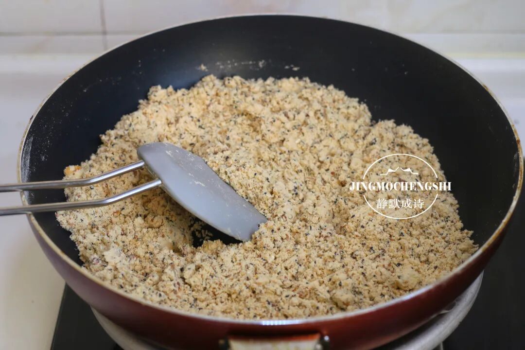 ①这个食谱是用炒的方法来做的,也可以全程使用烤箱来做:把面粉和辅料分别烤熟,面粉中加油再烤,拌匀,加入烤好的辅料再次拌匀即可,但我感觉没有炒的香。