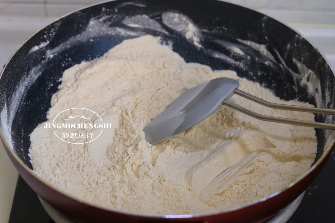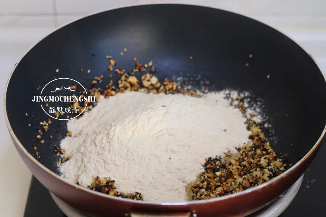 ④继续小火翻炒均匀,让油脂、辅料与面粉充分混合均匀。