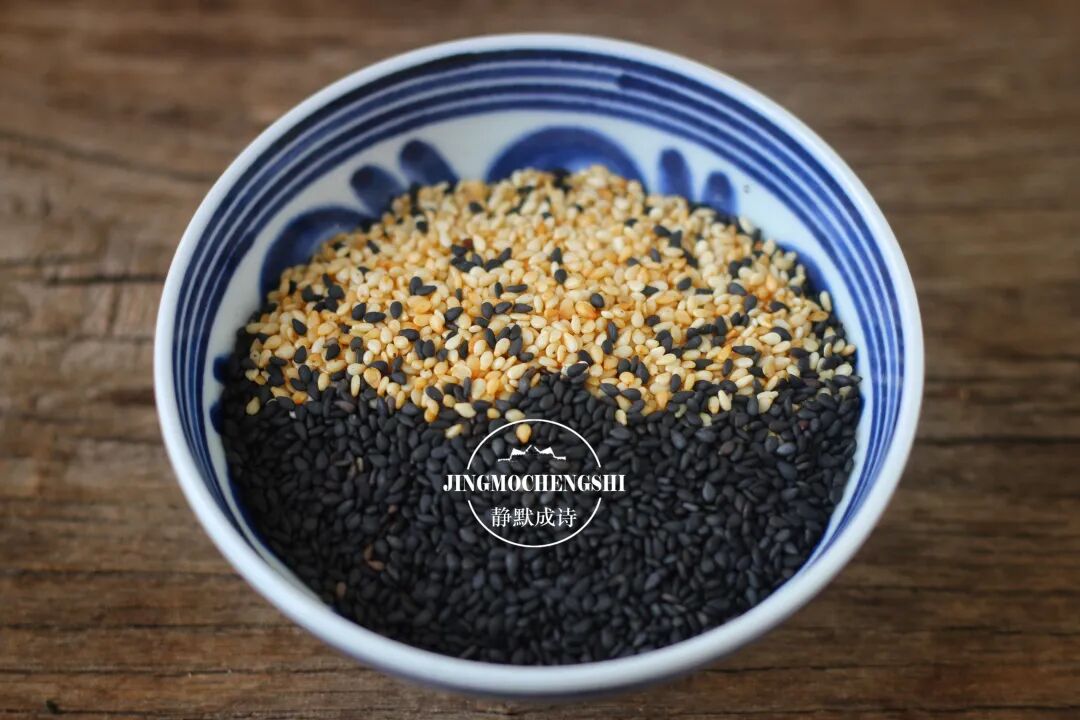 ①芝麻是做油茶面必不可少的辅料,黑白芝麻各60克,当然,要炒好的熟芝麻。分量不必固定,凭感觉各抓取一把就好。