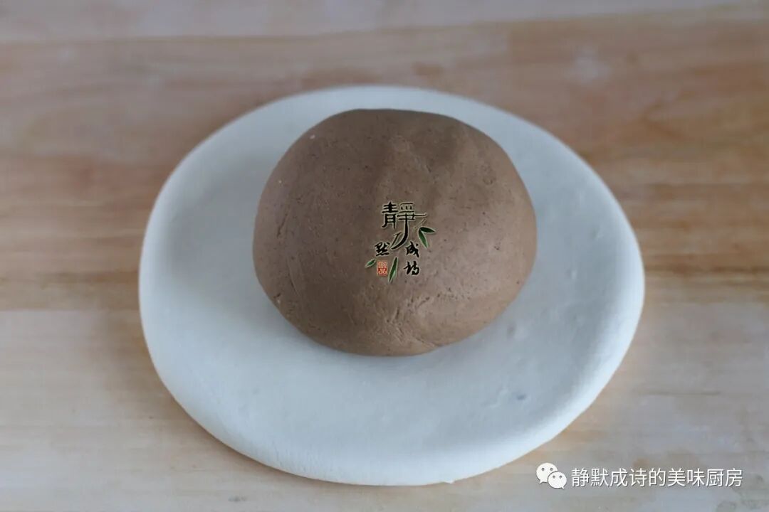 4、用白色面团把深色面团包住,收口捏住了。