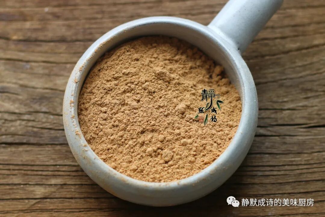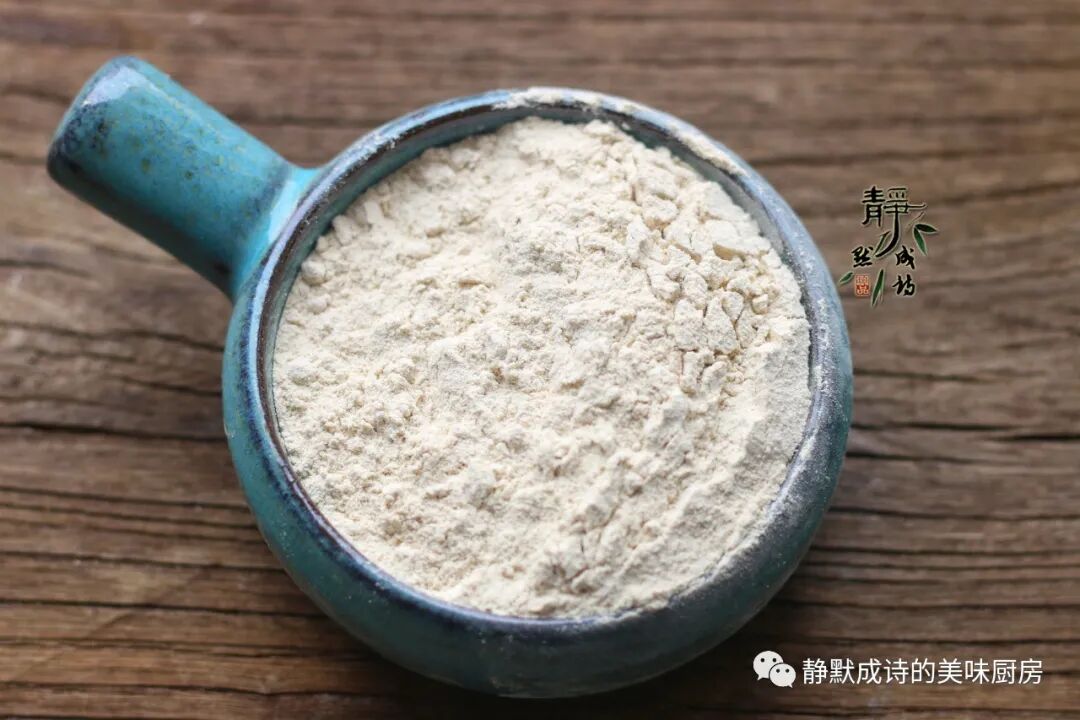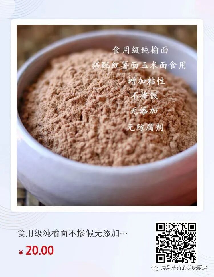 下图为榆皮面,取榆树根部的内皮磨成的粉,粘性高,与红薯面粉是好搭档。因为红薯面粉没有粘性,为了能和成面团,需要加些榆皮面。当然,加普通面粉也可以。