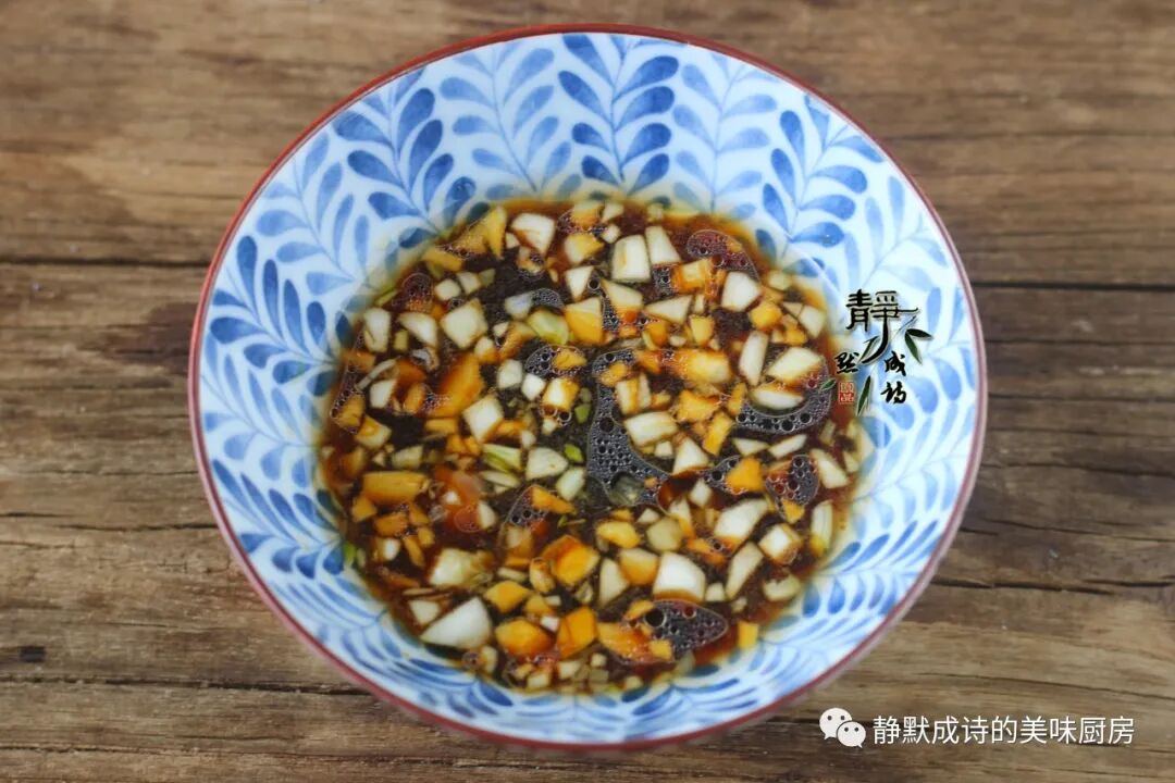 10、提前用酱油、陈醋、香油、蒜末、盐调好蒜汁儿。