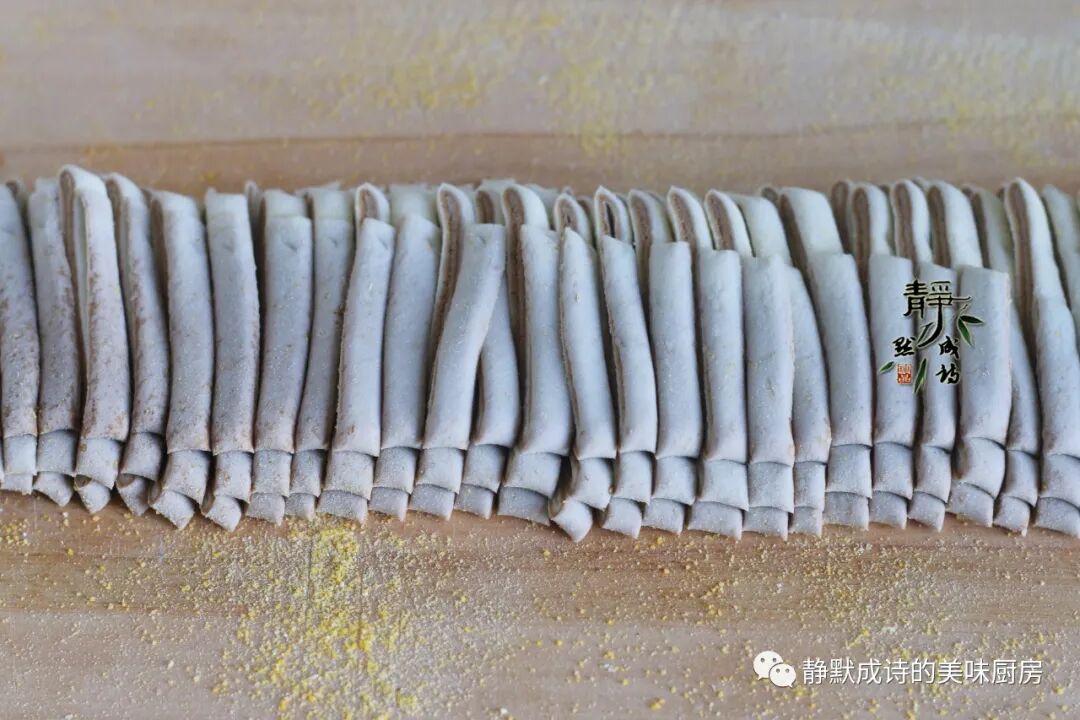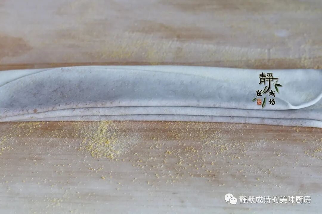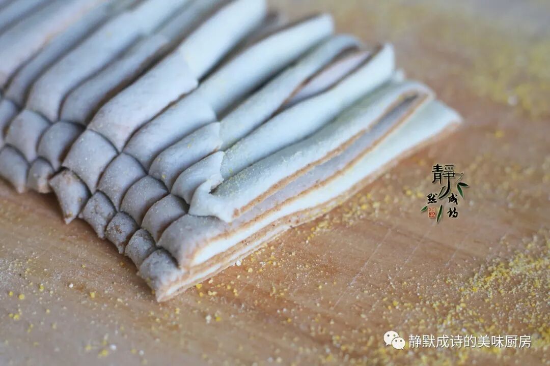 6、然后用点儿玉米面当干面撒在面片上防粘,像叠扇子纸一样把面片折叠好。