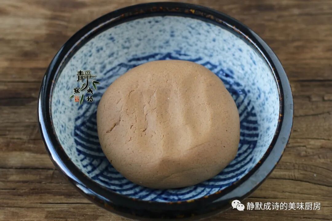 2、接着再把红薯面加少许榆面以及清水和成深色面团儿待用。红薯面没粘性,必须配合榆面一起使用才能成型。