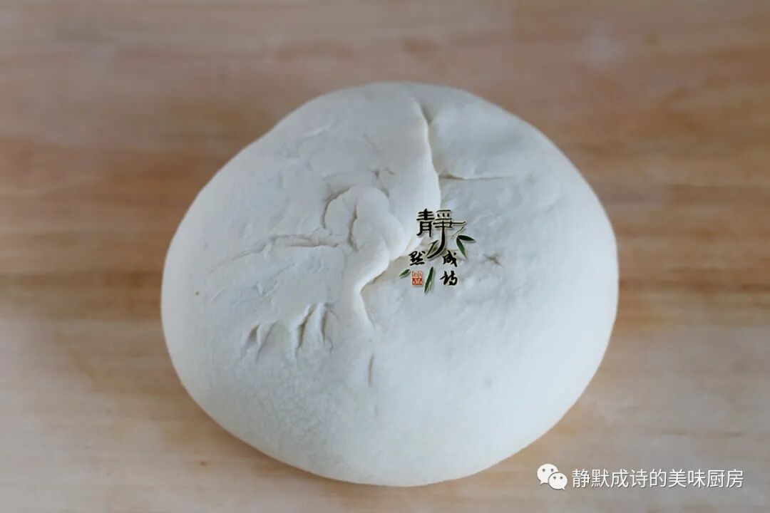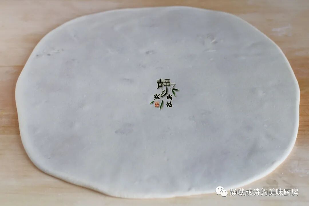 5、收口向下,用擀面杖把面团轻轻擀开,两面都要擀,擀成大的薄的面片状。图中的状态还不行,还厚,继续擀几下。