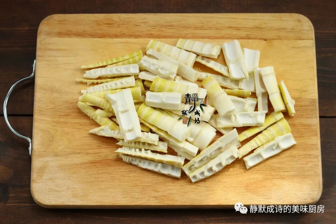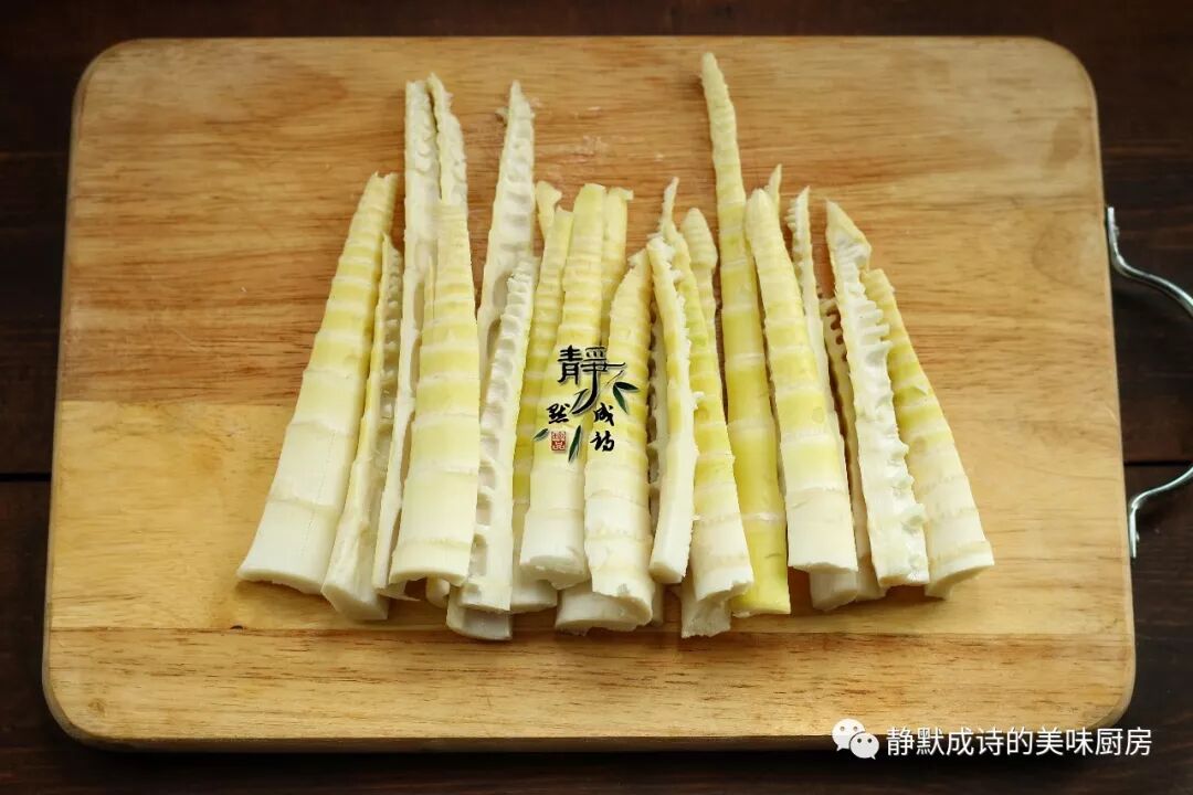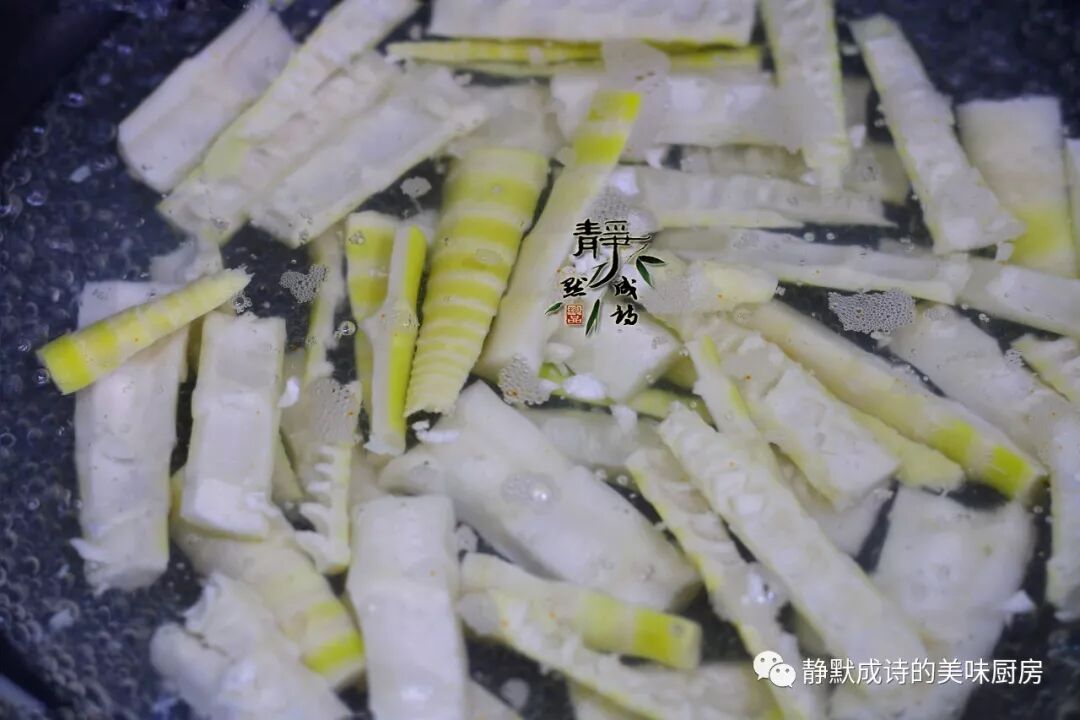 4、烧开半锅清水,水开后放入雷笋焯水两分钟,以去除笋中的草酸。这一步不能省哦!然后捞出马上用清水过凉后沥水。