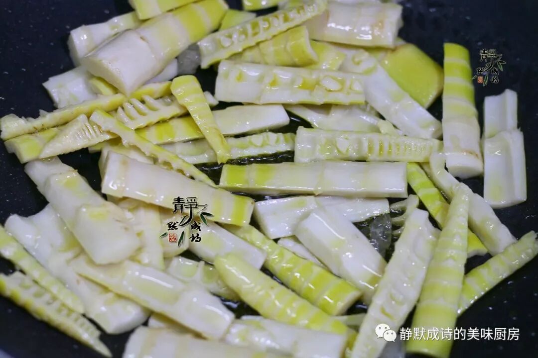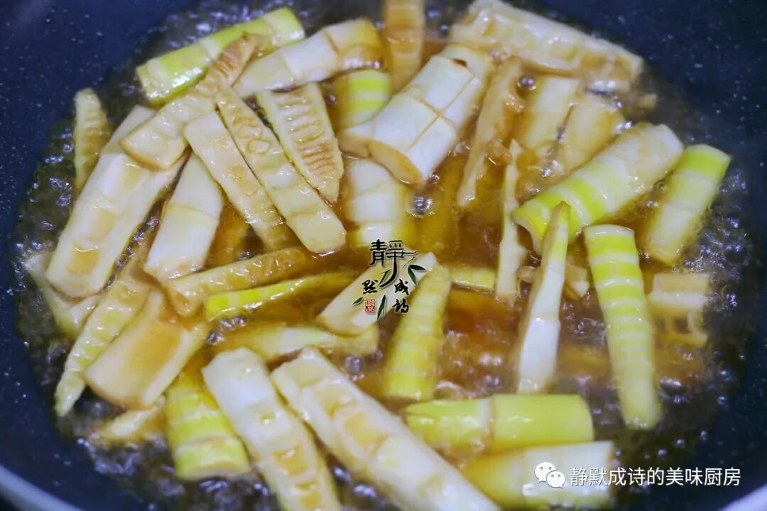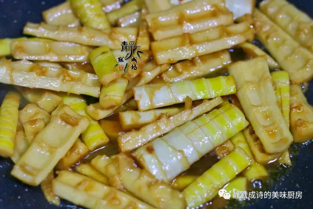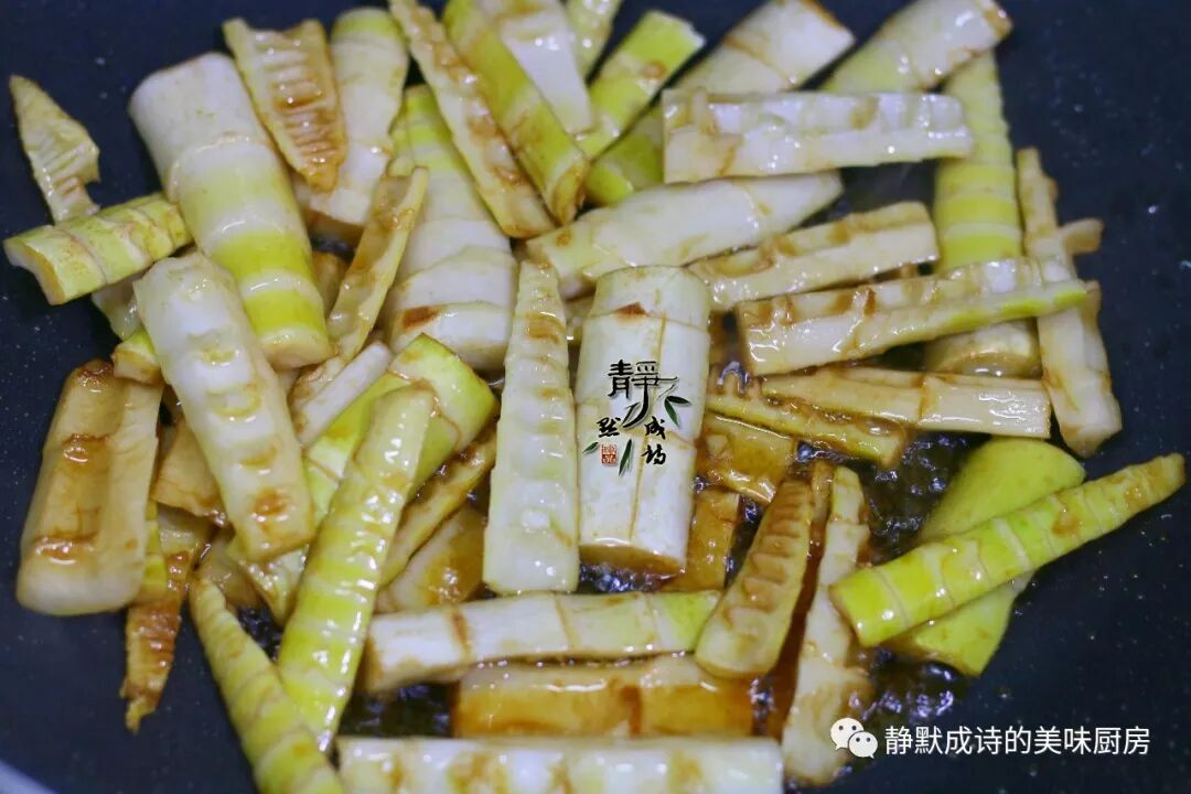 6、待笋稍稍发软时,烹入酱油,迅速翻炒均匀。
