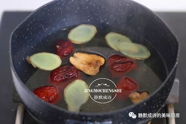 5、放到火上,煮开后再转小火焖煮三五分钟,让姜和红枣的味道充分溶于水中。