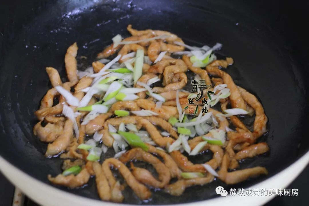 5、热锅热油,先加入腌制好的肉丝炒至变色,加入葱花蒜末小火炒香。