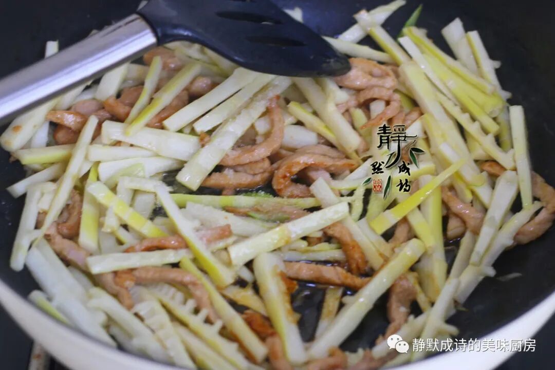 【食材】:雷笋四五根、猪里脊2两、葱蒜各适量、酱油两汤匙、淀粉1汤匙、油盐适量、白糖少许。