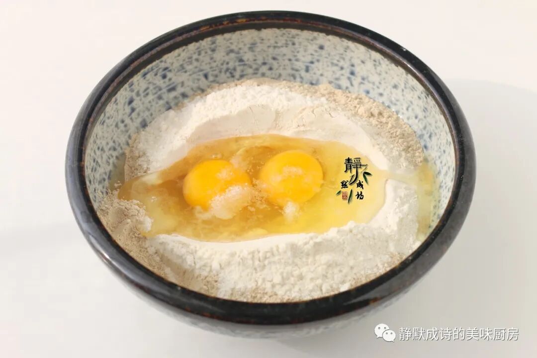3、磕入两枚鸡蛋,再加少许盐。由于红薯面粉是甜味的,所以,这里的盐一定要少放,一点点即可。