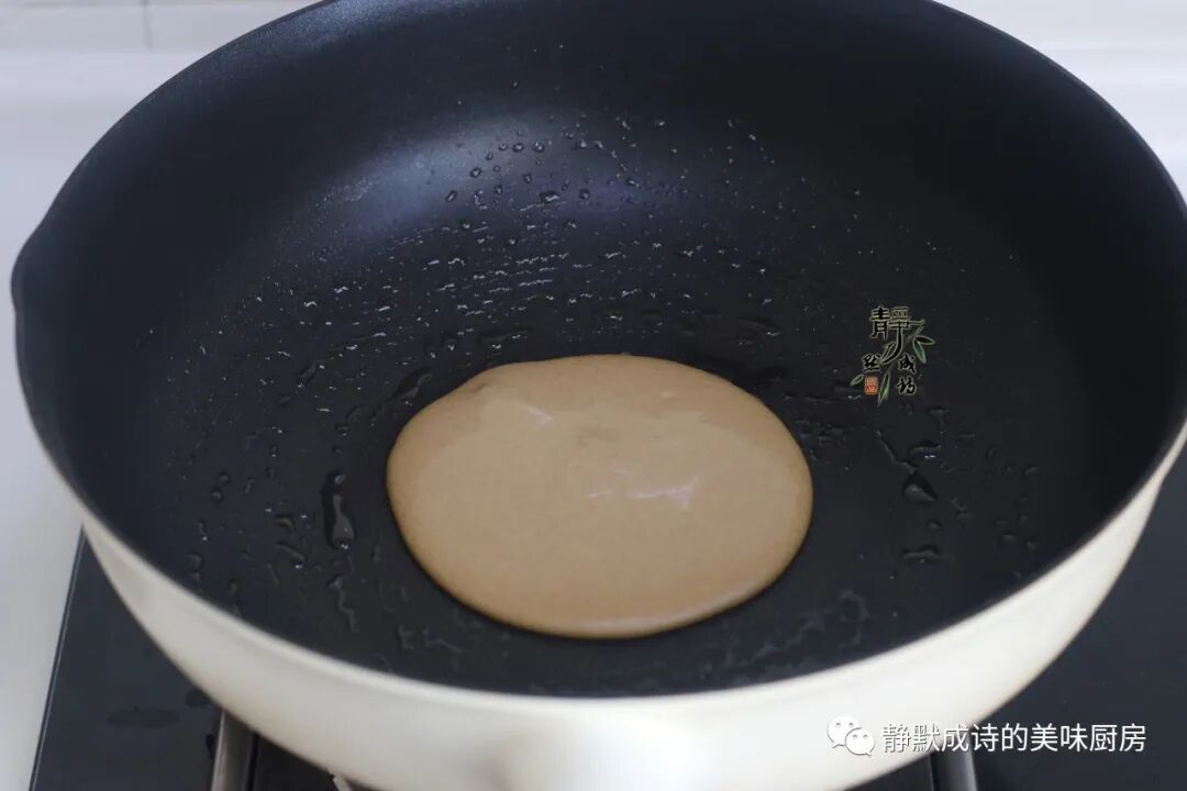 6、平底锅刷油,舀一勺面糊,垂直于锅底轻轻倒入,让它自然摊开成圆形。
