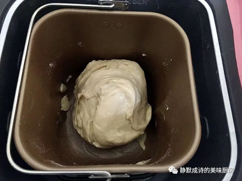 2、揉至面团比较光滑时加入软化的黄油,继续揉至出现手套膜的程度。