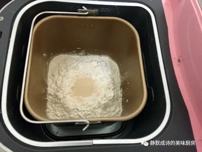 1、面包机内桶中依次放入牛奶、对角放盐和糖、面粉、酵母,启动和面程序。没有面包机也没关系,那就辛苦双手啦,采用后油法揉面。